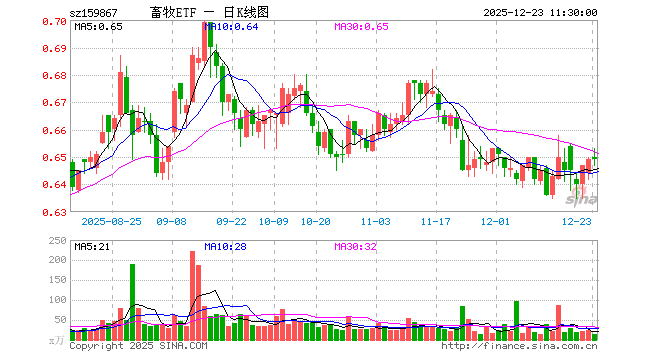12月23日,截止午间收盘,畜牧ETF(159867)涨0.00%,报0.649元,成交额911.54万元。畜牧ETF(159867)重仓股方面,牧原股份截止午盘跌0.26%,温氏股份跌0.76%,海大集团涨0.88%,新希望跌0.22%,梅花生物涨0.20%,大北农跌0.25%,圣农发展跌0.18%,生物股份涨4.37%,天康生物跌0.95%,立华股份跌0.89%。