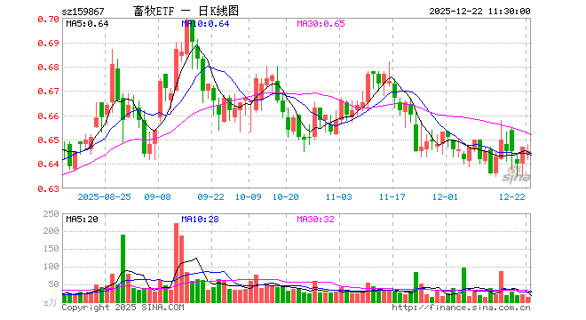 12月22日,截止午间收盘,畜牧ETF(159867)跌0.31%,报0.645元,成交额865.37万元。畜牧ETF(159867)重仓股方面,牧原股份截止午盘跌0.83%,温氏股份跌0.35%,海大集团跌0.49%,新希望跌0.11%,梅花生物跌0.20%,大北农涨0.00%,圣农发展涨0.55%,生物股份涨3.74%,天康生物跌0.68%,立华股份涨0.05%。