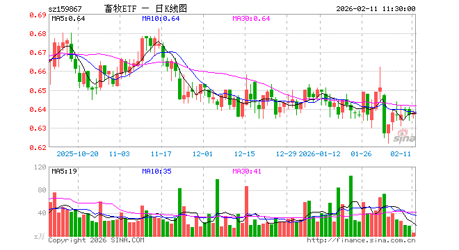 2月11日,截止午间收盘,畜牧ETF(159867)涨0.16%,报0.638元,成交额366.47万元。畜牧ETF(159867)重仓股方面,牧原股份截止午盘跌0.20%,海大集团跌0.09%,温氏股份跌0.44%,正邦科技涨0.63%,新希望跌0.12%,梅花生物涨1.82%,生物股份跌0.06%,大北农涨0.00%,圣农发展涨0.92%,立华股份涨0.05%。